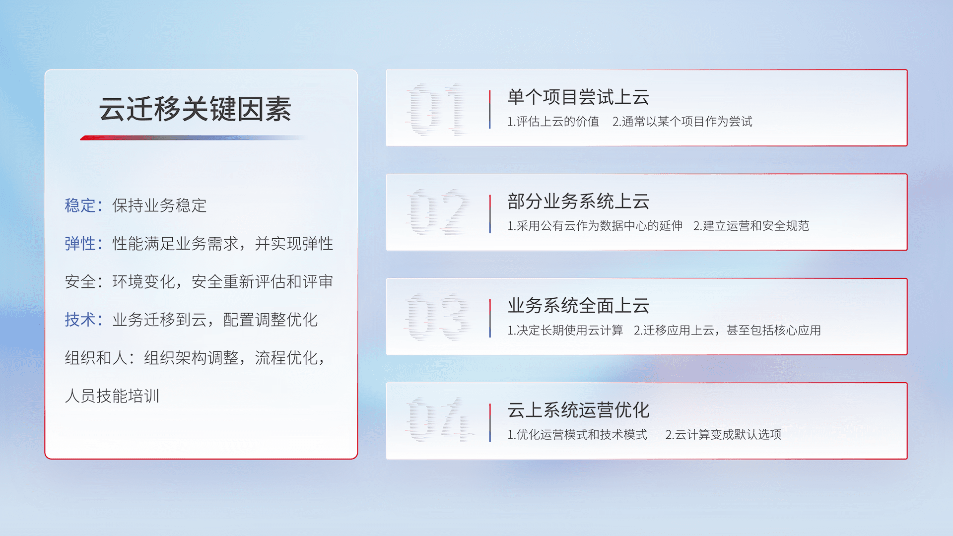 结合实际业务,,从规划设计、、、、云平台选型、、云原生改造、、、、数据迁移、、、集成交付,,迁移全过程为客户识别最佳上云路径,,,,做好风险识别管理,,,,设计网络架构、、、、身份权限、、安全审计合规、、操作审计、、、、日志审计、、监控告警策略、、、多站点容灾设计等,,,对云上基础设施进行整体规划,,提升IT治理水平,,,以满足弹性、、、高可用、、、高性能的需求。。。。